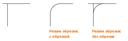 По умолчанию объекты, выбранные для добавления сопряжения или скругления, обрезаются или удлиняются до получаемой в результате этой операции дуги. С помощью параметра "Обрезка" можно указать, будут ли выбранные объекты изменены или оставлены без изменений.