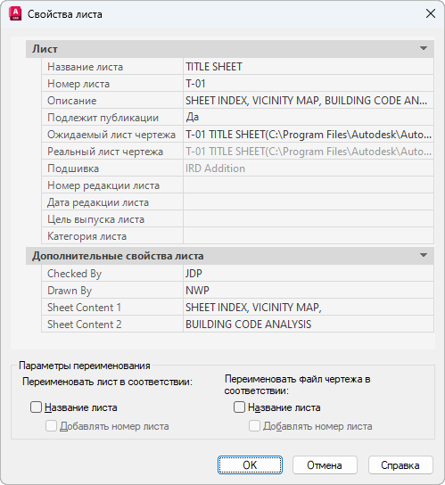 Отображение параметров переименования выбранного листа. Это те же настройки, что и в диалоговом окне "Смена названия и номера листа".