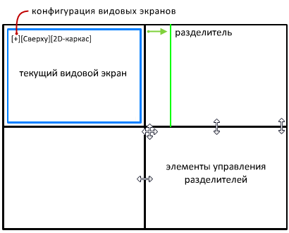 При наличии нескольких видовых экранов текущий видовой экран выделяется синим прямоугольником.