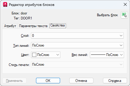 Здесь задается слой, на котором находится атрибут, вес и тип линий, а также цвет текста атрибута. Если чертеж использует именованные стили печати, с помощью данной вкладки можно связать атрибут со стилем печати.