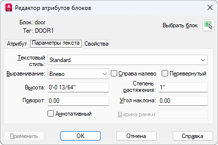 Задает свойства, определяющие способ отображения на чертеже текста атрибута. Цвет текста атрибута изменяется на вкладке "Свойства".