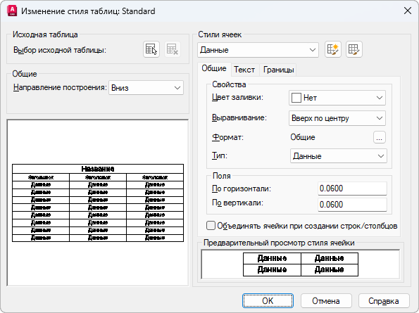 Этот параметр позволяют выбрать на чертеже таблицу для применения в качестве образца при форматировании данного стиля таблиц. После выбора таблицы можно указать элементы структуры и содержимого, которые требуется скопировать из этой таблицы в стиль таблиц.