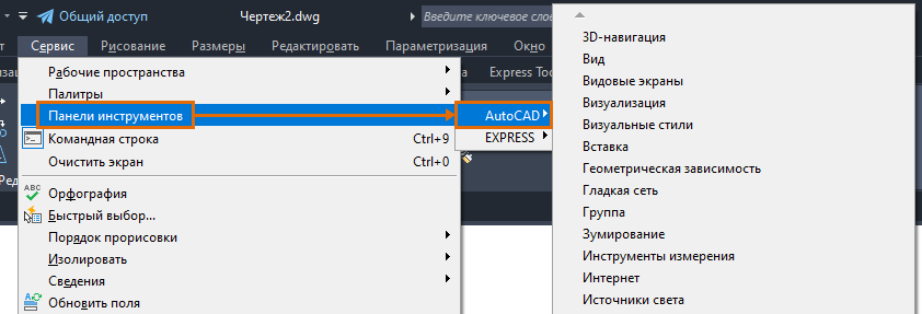 и выберите нужную панель инструментов.