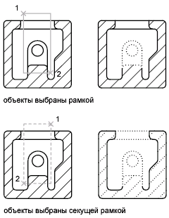 Обычно при выборе рамкой выбираемые объекты должны полностью находиться в прямоугольной области. Однако, если объект, построенный с помощью прерывистой линии (пунктира), лишь частично виден в видовом экране, а все видимые векторы типа линии находятся внутри рамки, объект будет выбран целиком.