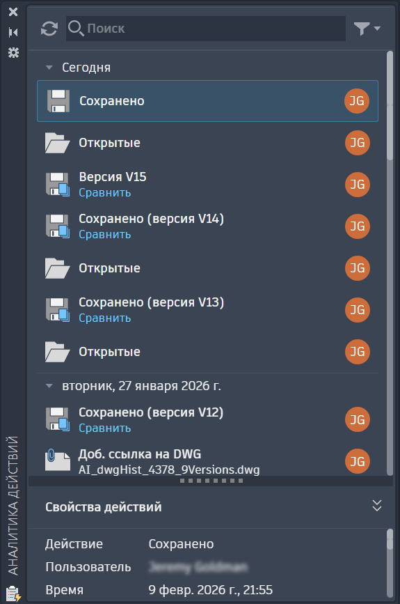 Функция «Аналитика действий» записывает изменения, внесенные каждым участником проекта, в файл чертежа, оптимизируя совместную работу и позволяя возвращаться к работе с того места, где вы остановились.