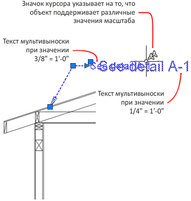 На следующей иллюстрации показана мультивыноска, которой назначено два различных масштаба объектов.