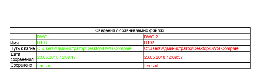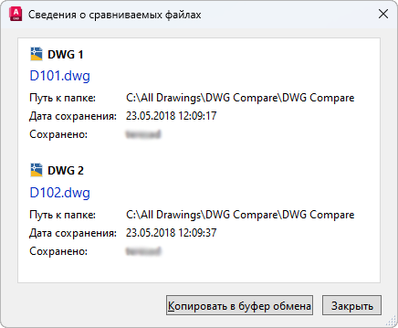 Данная команда открывает диалоговое окно с информацией о двух сравниваемых файлах чертежа. Доступно создание таблицы с указанной информацией и копирование информации в буфер обмена.