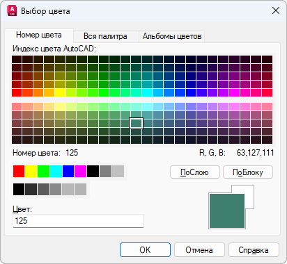 Можно выбрать цвет для элементов окна из 255 цветов, входящих в Индекс цветов AutoCAD (ИЦА), а также из всей палитры или из альбома цветов, используя три предоставленных вкладки.
