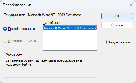 Отображает тип преобразуемого или активизируемого объекта.