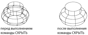 Если системная переменная DISPSILH включена, команда СКРЫТЬ отображает объекты 3D-тела и поверхности с кромками силуэтов и подавляет отображение фасетных граней. Объекты-сети 3D не затрагиваются.