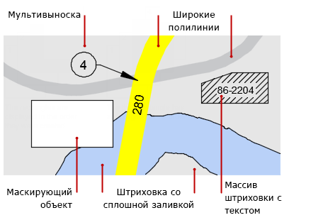 Можно управлять перекрывающимися объектами, например объектами с толстыми весами линий, широкие полилинии, штриховки и заливки, аннотации и изображения. Например, на следующей карте представлено несколько типов перекрывающихся объектов. Очевидно, что порядок, в котором эти объекты отображаются и выводятся на печать, имеет большое значение.