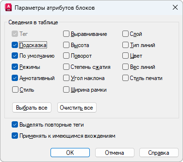 Режим обновления всех существующих блоков, атрибуты которых были изменены. Если опция активна, обновляются все блоки с новыми описаниями атрибутов. Если опция не активна, обновляются только новые блоки, созданные после изменения определений атрибутов.