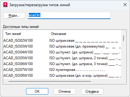 Отображается имя LIN-файла текущей библиотеки типов линий. Можно ввести имя другого файла LIN или нажать кнопку "Файл", чтобы выбрать файл в диалоговом окне "Выбор файла типов линий".