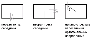 Например, отслеживание можно использовать для определения центра прямоугольника без построения вспомогательных линий. Для этого необходимо включить отслеживание и указать середину горизонтального отрезка. Затем вертикально переместите курсор до середины вертикального отрезка (2). Нажмите клавишу ВВОД, чтобы принять точку (3) в центре прямоугольника.