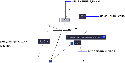 В случае использования ручек для редактирования объекта, подсказки для ввода размеров могут отображать следующую информацию: