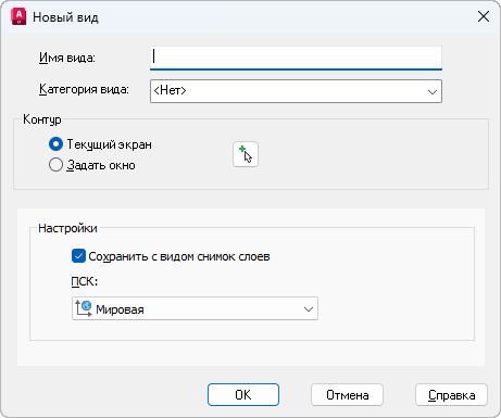 Сохранение нового именованного вида на основе того, что отображается на текущем видовом экране, или на основе выделения прямоугольной рамкой.