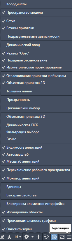 1. Щелкните кнопку «Адаптация», расположенную с краю в правой части строки состояния, и выберите элементы, которые необходимо отобразить. найти