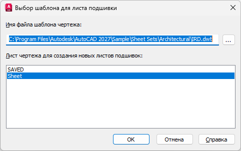 На экран выводится список и указывается имя листа в файле шаблона чертежа, который будет использоваться при создании новых листов.