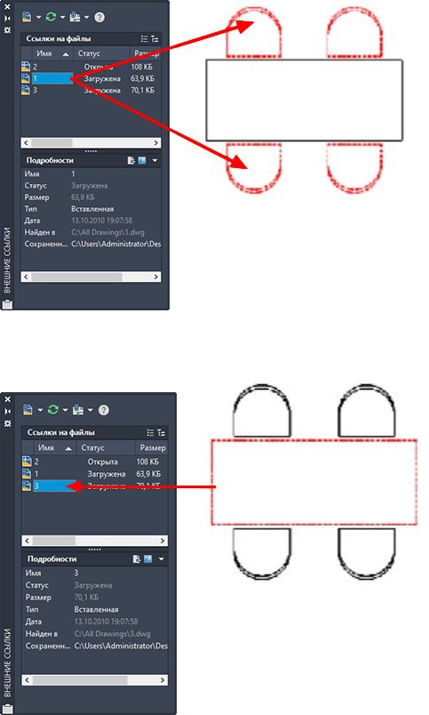 Если в главном чертеже имеются вложенные внешние ссылки, то для их удаления необходимо открыть файл внешней ссылки, в которую они вложены, и удалить их там, а не через главный чертеж. Дерево палитры «Внешние ссылки» можно использовать для просмотра взаимосвязей всех вставленных внешних ссылок.