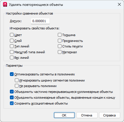 Эти параметры служат для управления тем, как команда OVERKILL обрабатывает линии, дуги и полилинии.
