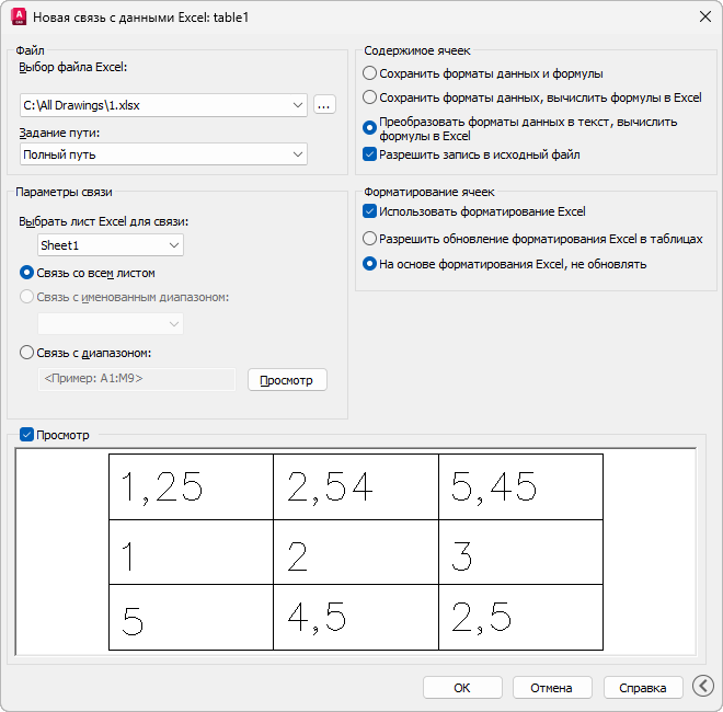 При выборе этой опции форматирование, указанное в исходном файле XLS, XLSX или CSV, будет передано в чертеж, но любые сделанные в форматировании изменения не будут включены, когда используется команда СВЯЗЬОБНОВИТЬ.