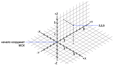 В приведенной ниже иллюстрации координаты 3,2,5 определяют точку в следующем местоположении: 3 единицы вдоль положительной оси X, 2 единицы вдоль положительной оси Y и 5 единиц вдоль положительной оси Z.
