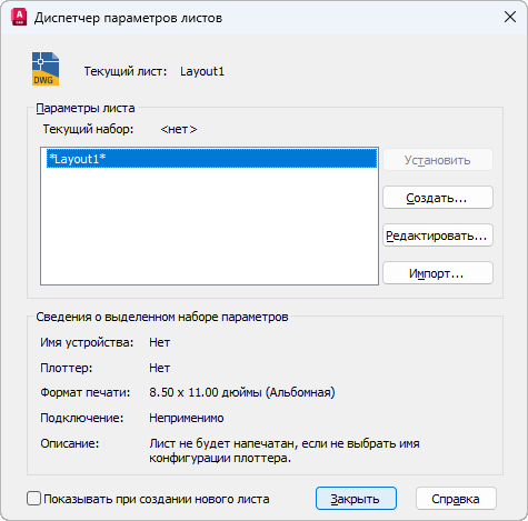 Отображает текущий набор параметров листа; позволяет изменить текущий набор, создать новый набор, изменить параметры существующих наборов и импортировать параметры листа из других чертежей.