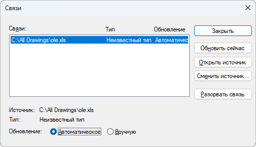Разрыв связи между связанным объектом и его файлом-источником. Объект в чертеже преобразуется в формат WMF (формат метафайлов Windows), при этом дальнейшие изменения исходного файла не влияют на этот объект.