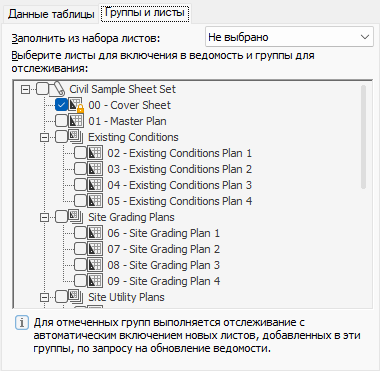 Отображение параметров, управляющих набором листов, представленных в текущей таблице со списком листов.