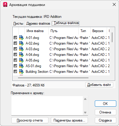 Список файлов, включаемых в упаковку архива, в виде таблицы. По умолчанию сюда заносятся все файлы, на которые ссылается текущий чертеж (такие как внешние ссылки, стили печати и шрифты). Пользователь может добавить файлы в упаковку архива или удалить существующие файлы из него. В архив не включаются файлы, ссылки на которые установлены посредством URL.