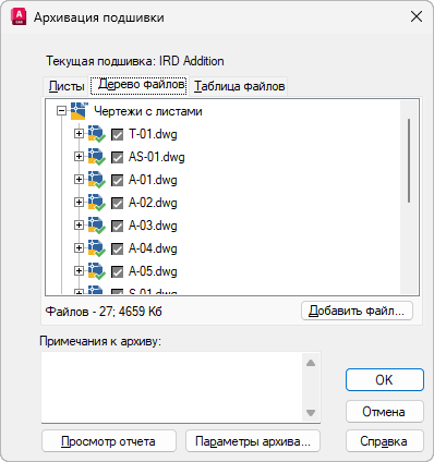 Отображение списка файлов, включаемых в пакет архива, в виде иерархического дерева. По умолчанию в этом списке перечислены все файлы, связанные с текущим чертежом (внешние ссылки, стили печати и шрифты). Пользователь может добавить файлы в упаковку архива или удалить существующие файлы из него. В архив не включаются файлы, ссылки на которые установлены посредством URL.