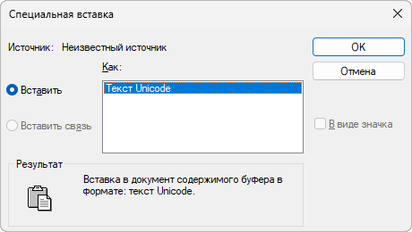Содержимое буфера обмена помещается в текущую позицию курсора как внедренный объект.