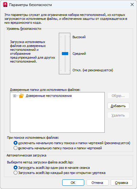 Определение уровня ограничения пути для исполняемых файлов, а также отображение диалогового окна с предупреждением. (системная переменная SECURELOAD)
