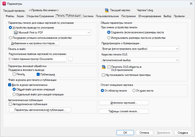 Вкладка позволяет задать параметры вывода на печать и публикации чертежей.