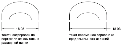 Кроме того, текст можно передвинуть или, наоборот, вернуть в исходное положение, определяемое текущим размерным стилем. На следующей иллюстрации исходное положение текста задано над размерной линией в центре.