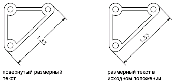 Размерный текст можно переместить вдоль размерной линии вправо, влево или к центру, а также разместить вне выносных линий или между ними. Наиболее быстрый и простой способ перемещения достигается использованием ручек. При перемещении текста вверх и вниз изменяются выносные линии и положение размерной линии; режим вертикального выравнивания текста относительно размерной линии сохраняется. На следующем чертеже показан результат перемещения текста вниз и вправо. Положение текста по вертикали относительно размерной линии сохраняется.