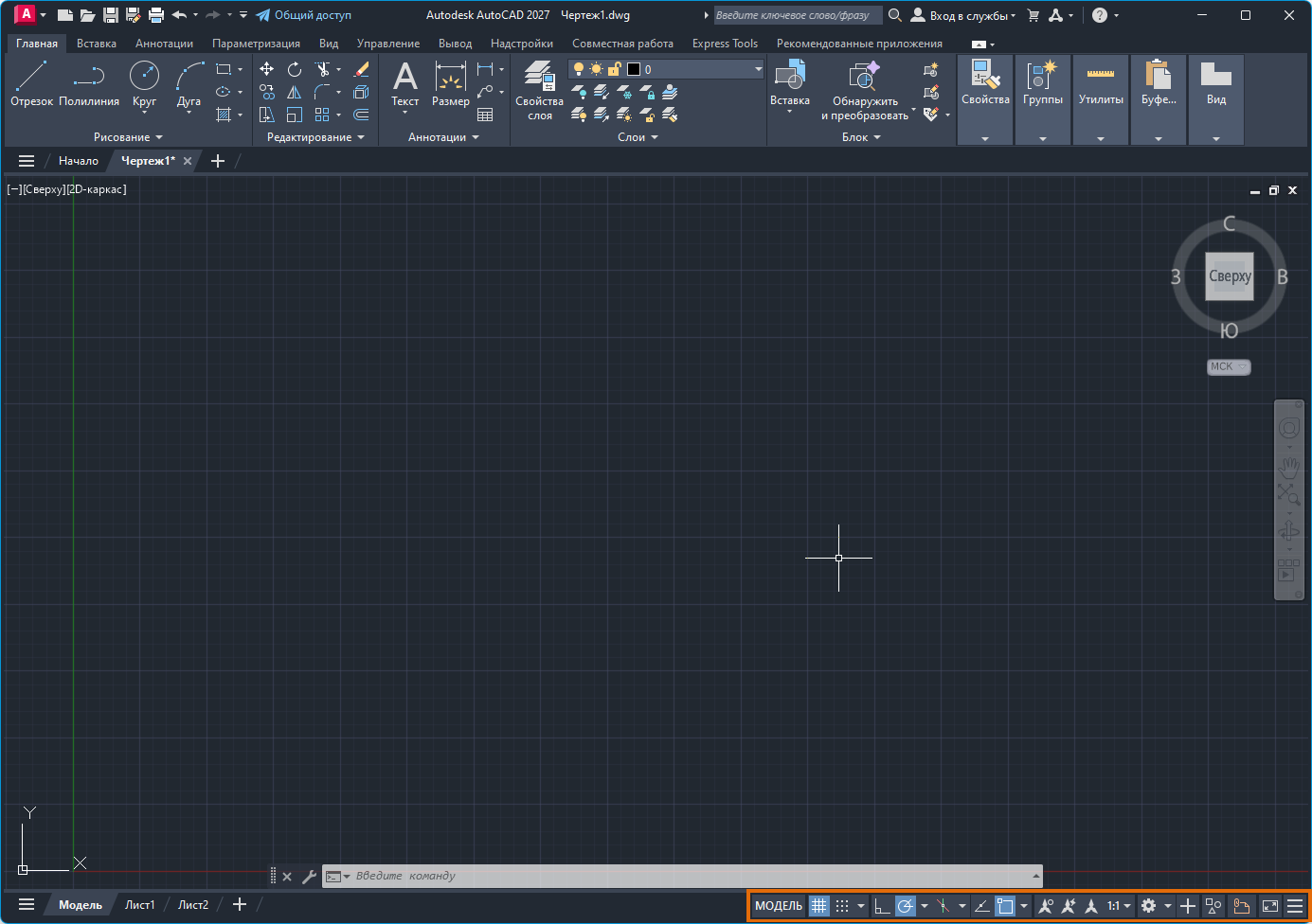 В строке состояния отображается положение курсора, инструменты чертежа, а также инструменты, которые влияют на среду чертежа.