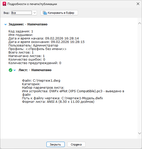 Отображение информации о задачах печати и публикации, выполненных в текущем сеансе.