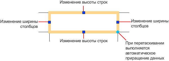 Для выделения ячейки укажите точку внутри нее. На середине каждой границы ячейки появляется ручка. Для перемещения выбранных данных в другую ячейку щелкните внутри этой ячейки. С помощью ручек можно изменить ширину и высоту ячейки и, соответственно, ширину и высоту ее столбца и строки.