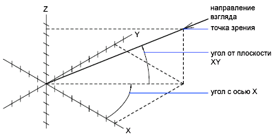 Направление взгляда можно задать либо координатами точки обзора, либо двумя углами относительно координатных осей и плоскостей.