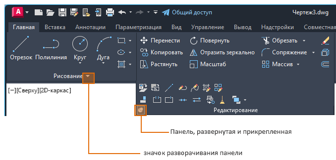 Можно перетащить панель с вкладки ленты в область чертежа или на другой монитор. Плавающая панель остается открытой до тех пор, пока не будет возвращена на ленту даже при переключении вкладок ленты.