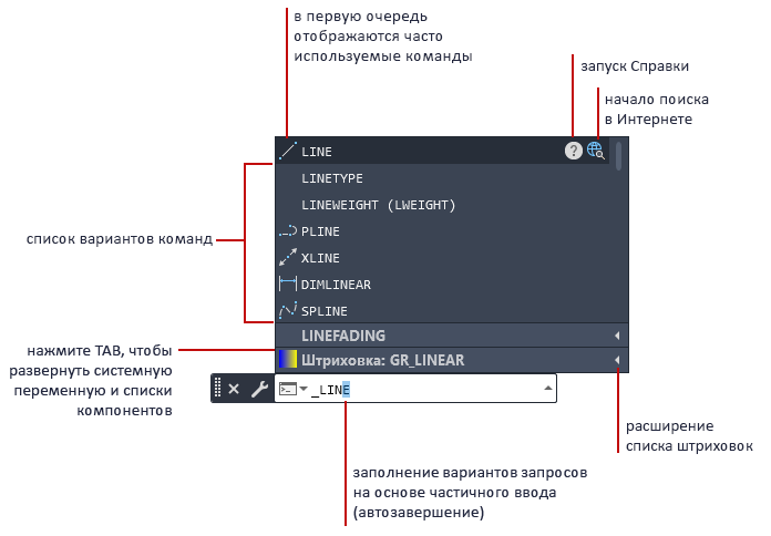 Список предлагаемых вариантов команд отображается при вводе первых букв команды в окне команд или в поле динамического ввода. По умолчанию список имеет следующие характеристики.