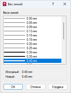 Отображает список имеющихся весов линий, которые могут быть применены для слоя. Здесь перечислены фиксированные значения весов линий, наиболее часто используемые в чертежах. Выбрать нужный вес линий для применения.