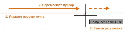 Задание конечной точки линейного сегмента. Полярное и объектное отслеживание можно использовать совместно с методом "направление-расстояние".
