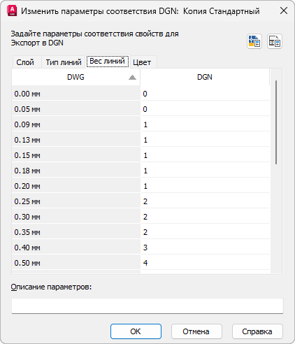 В таблице содержится предопределенный набор весов линий, представляющий собой наилучшее соответствие между весами, используемыми в файлах DGN и DWG. Веса линий можно копировать и вставлять (по одному или по несколько) с помощью контекстного меню в правом столбце. На вкладке "Вес линий" можно вносить изменения только в правый столбец. Редактирование левого столбца невозможно.