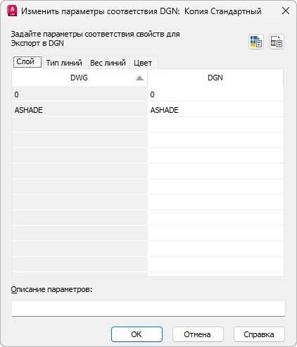 Параметры соответствия для экспорта: Если диалоговое окно "Изменить параметры соответствия DGN" вызвано путем создания нового набора параметров соответствия в диалоговом окне "Параметры экспорта в DGN", в столбце "DWG" содержатся все типы линий, определенные в текущем чертеже. Если ячейка назначения пустая (правый столбец), используется заданное по умолчанию значение соответствия системы.