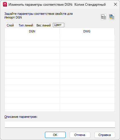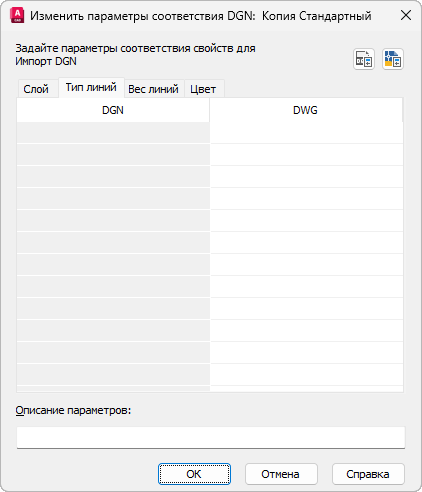 Импорт параметров соответствия: Если диалоговое окно "Изменить параметры соответствия DGN" вызвано при создании нового набора параметров соответствия в диалоговом окне "Параметры импорта DGN", в столбце "DGN" содержатся все типы линий, определенные в импортируемом файле DGN, а также определенные в файле-прототипе DGN на момент создания файла DGN.