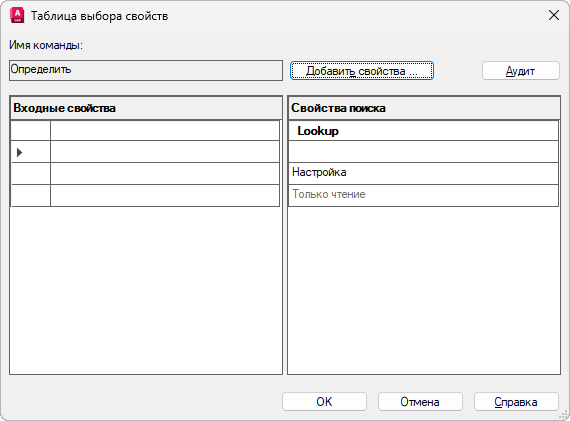 Диалоговое окно "Таблица выбора свойств"