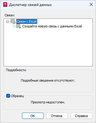 Перечисляет связи с данными Microsoft Excel в пределах чертежа. Если значок отображает цепочку связи, то связь с данными допустима. Если значок отображает разрушенную цепочку связи, то связь с данными прервана.