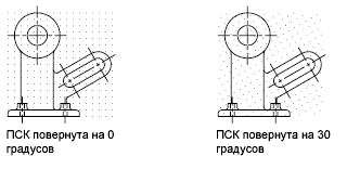 Если требуется создание чертежа с определенным выравниванием или под определенным углом, можно изменить угол привязки и сетки путем поворота пользовательской системы координат (ПСК). При этом вид перекрестья и ориентация сетки также изменятся. Приведенный ниже пример иллюстрирует поворот ПСК на 30 градусов для согласования с углом анкерного кронштейна.